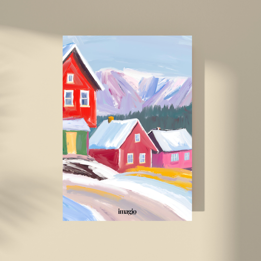 Red Houses in Norwegian Fyord - Snowy