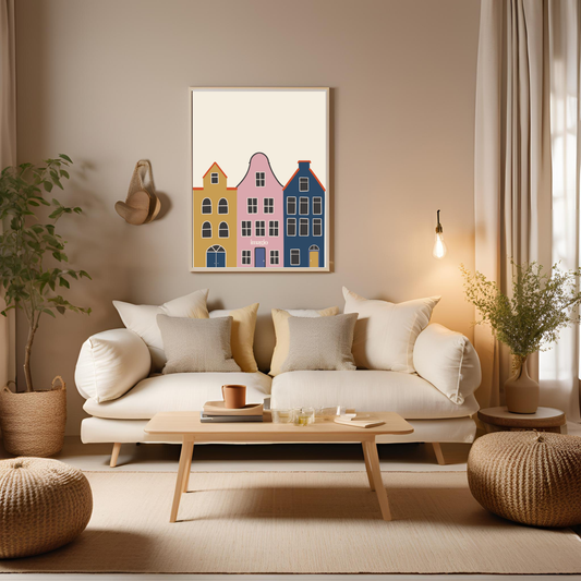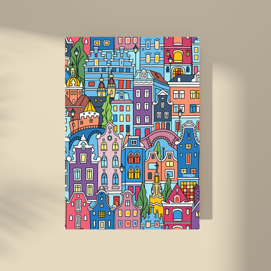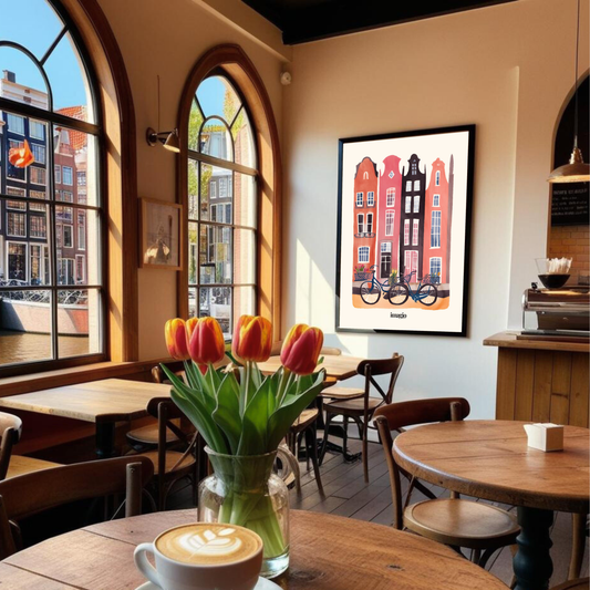 "Tulips and Fairytale Houses" is a captivating collection of digital art prints that beautifully encapsulates the charm and vibrancy of Amsterdam. This series features enchanting depictions of the city's iconic colorful houses, each one uniquely illustrated to highlight their whimsical architecture. The collection is adorned with vivid tulips, symbolizing the floral beauty that Amsterdam is renowned for. These digital prints include a variety of artistic styles, from detailed watercolor posters that bring a soft, dreamy quality to the scenes, to old black and whites and bold letter posters in different hues that spell out the essence of the city. Each piece in the "Tulips and Fairytale Houses" collection is designed to bring a touch of Amsterdam’s magic into any space, celebrating its rich cultural heritage and picturesque landscapes. Whether you're a lover of travel, art, or simply in need of a daily dose of inspiration, this collection offers a delightful visual journey through one of Europe's most beloved cities.