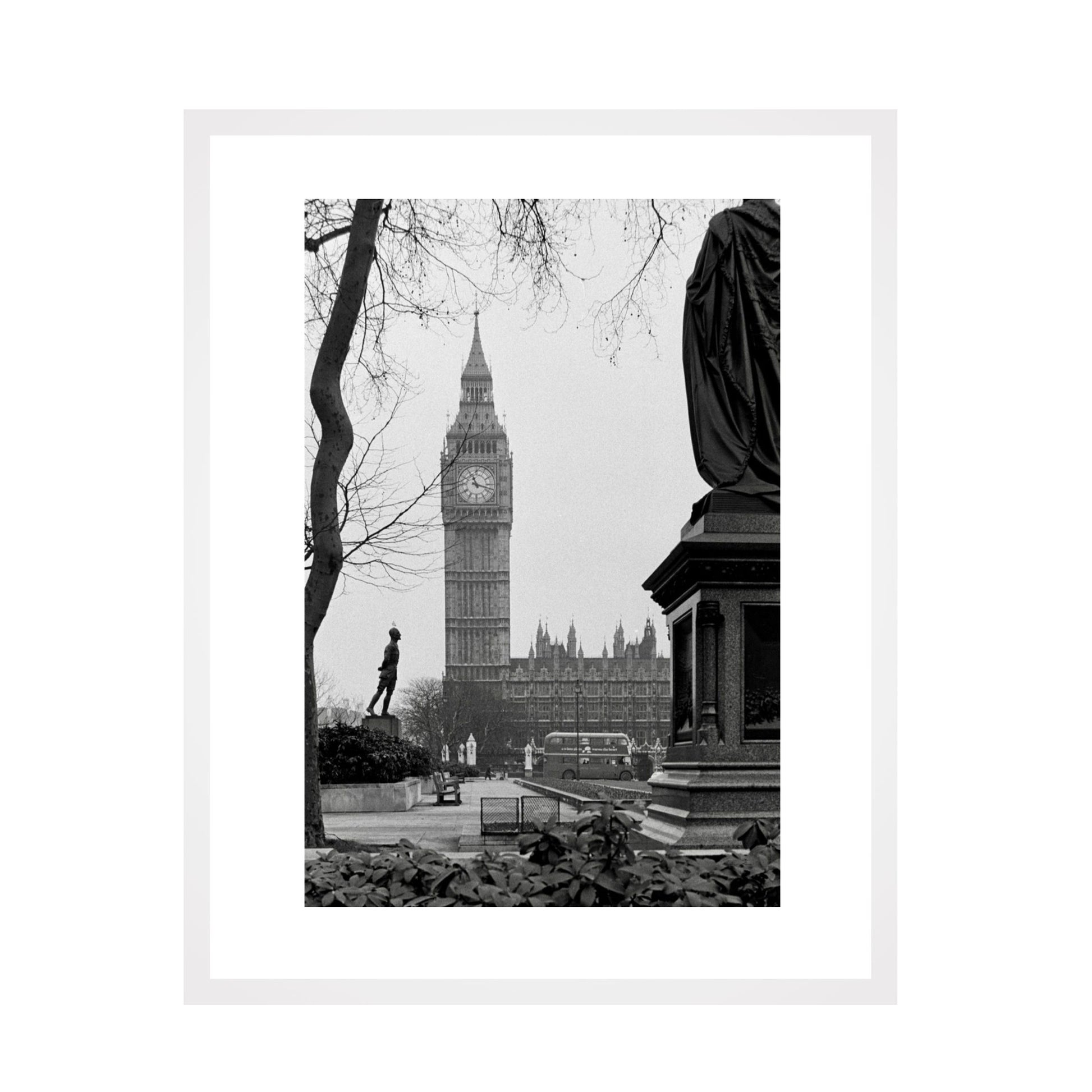 This vintage photograph captures the north end of the Palace of Westminster as seen from Parliament Square Garden in London. The iconic Gothic architecture rises majestically, offering a glimpse into the historic heart of British politics and the timeless elegance of the cityscape.