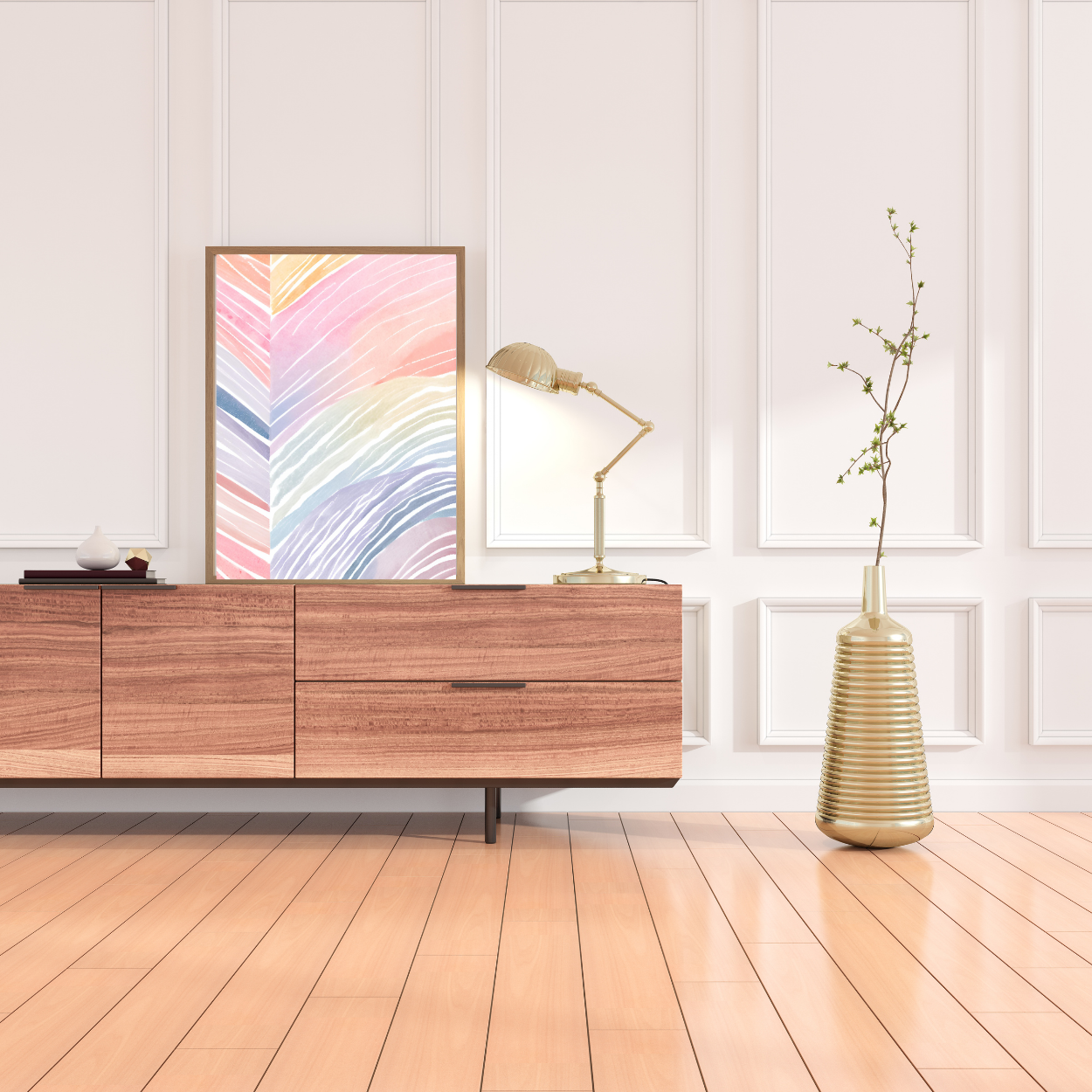 Expertly crafted, this art print features abstract lines in pastel color palette tones, flowing seamlessly together. With its unique design, barely visible, white background and soothing pastel tones, it adds a touch of sophistication to any space. Transform your room with this masterpiece and enjoy a serene atmosphere.