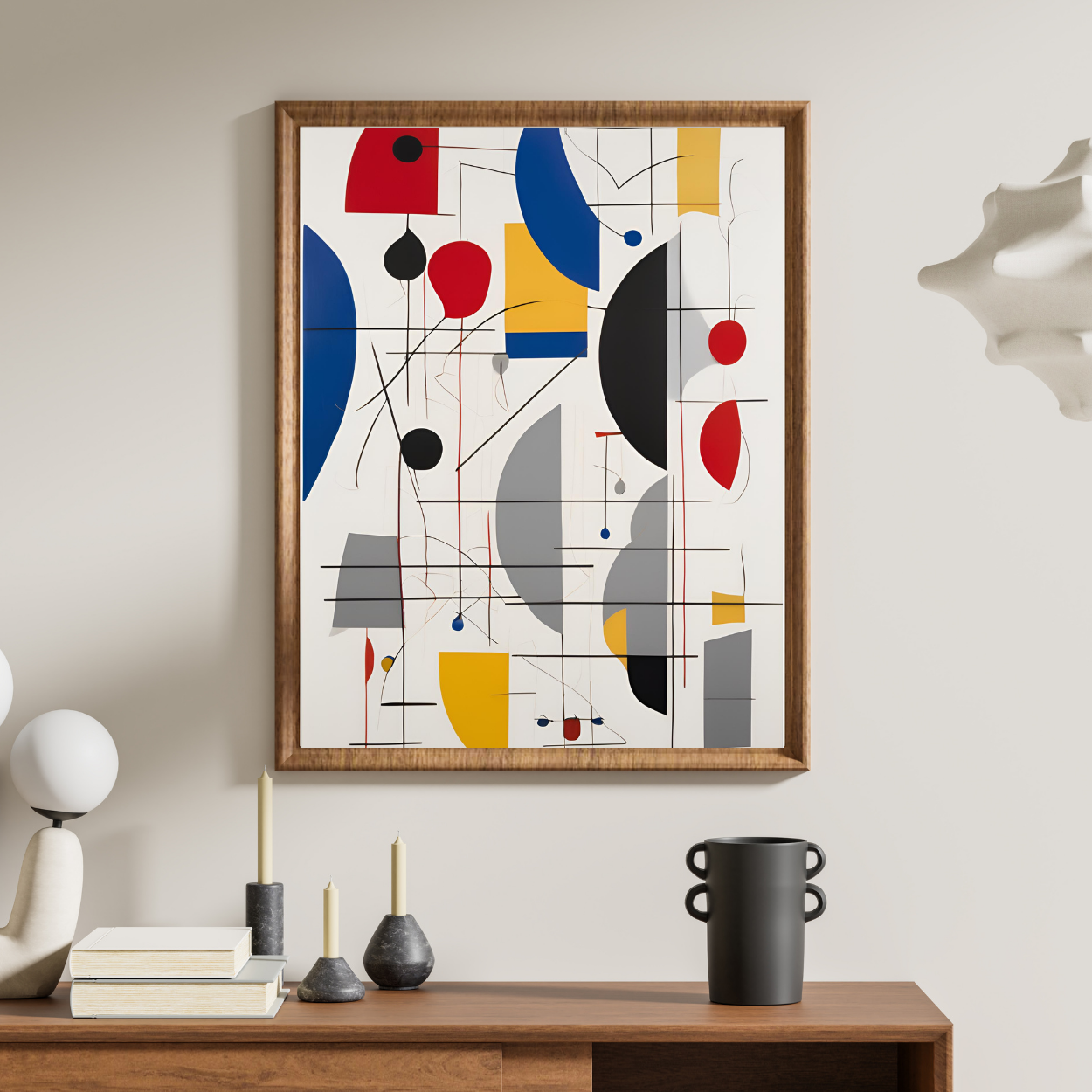 Expertly crafted, this art print features abstract shapes in blue, red and yellow color palette tones, floating on the white background. With its unique design and contrast color tones, it adds a touch of sophistication to any space. Transform your room with this masterpiece and enjoy a serene atmosphere.