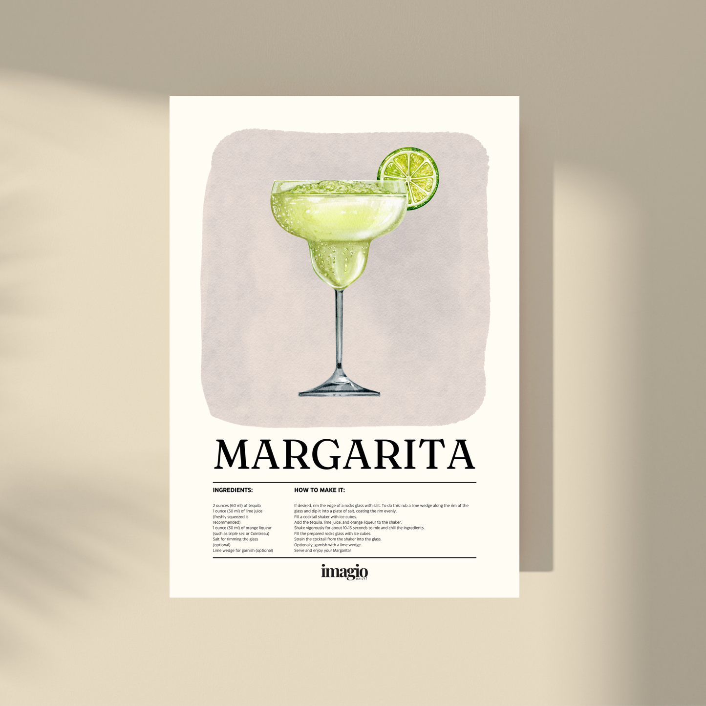 Mix art and cocktails with this fun watercolor print of a Margarita cocktail on a beige background. Comes with a recipe to recreate the perfect drink. Cheers!