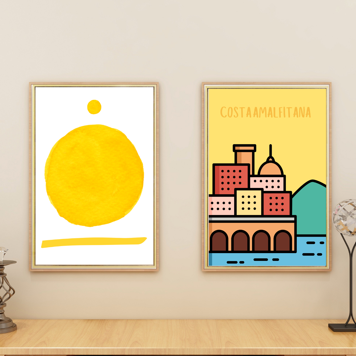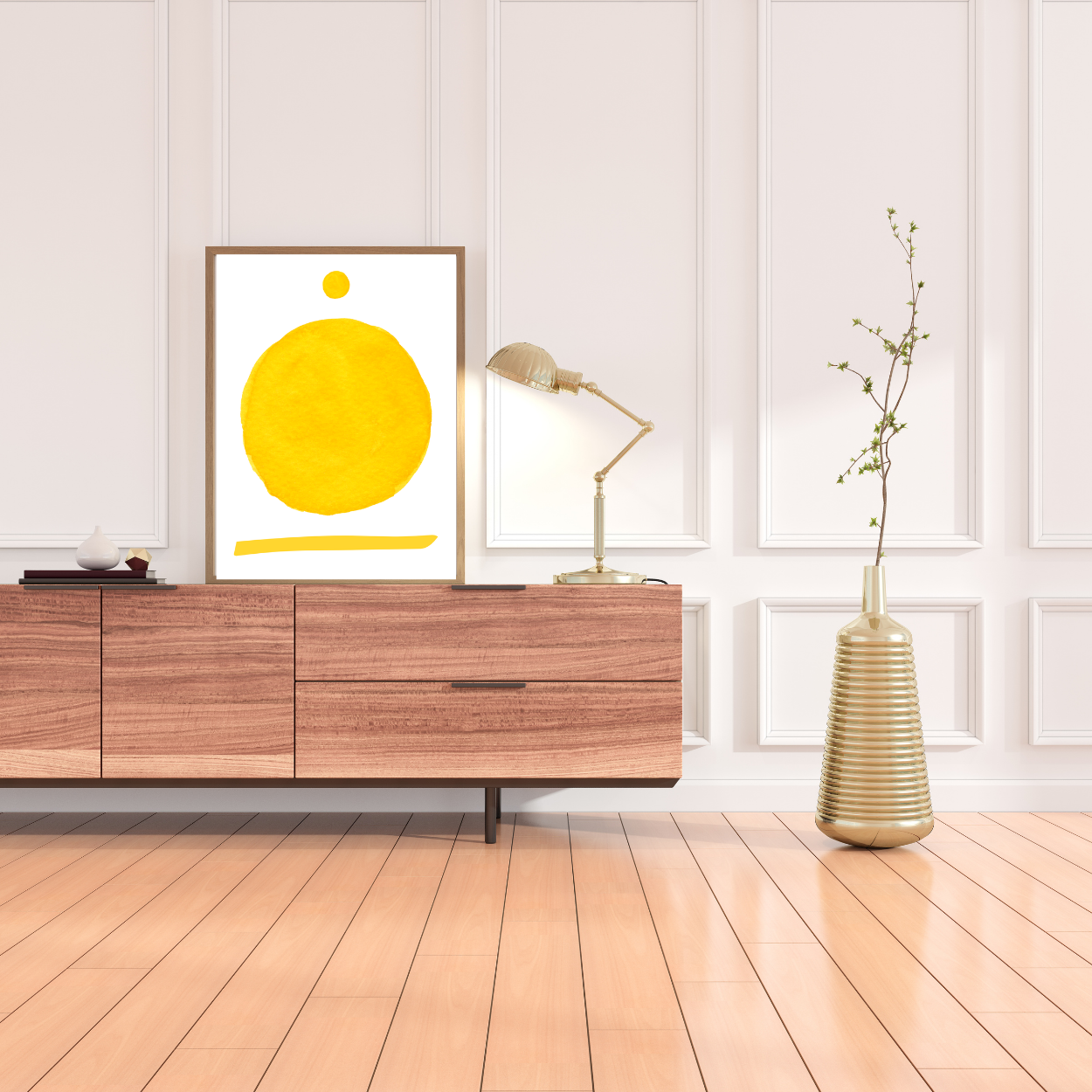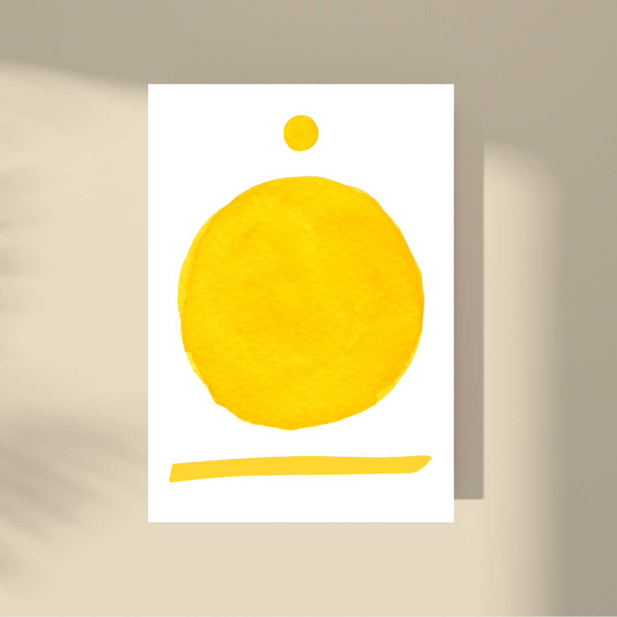 Expertly crafted, this art print features one main yellow circle with smaller one above and a line below, all on white background. With its unique design and bright yellow color, it adds a touch of sophistication to any space. Transform your room with this masterpiece and enjoy a serene atmosphere.