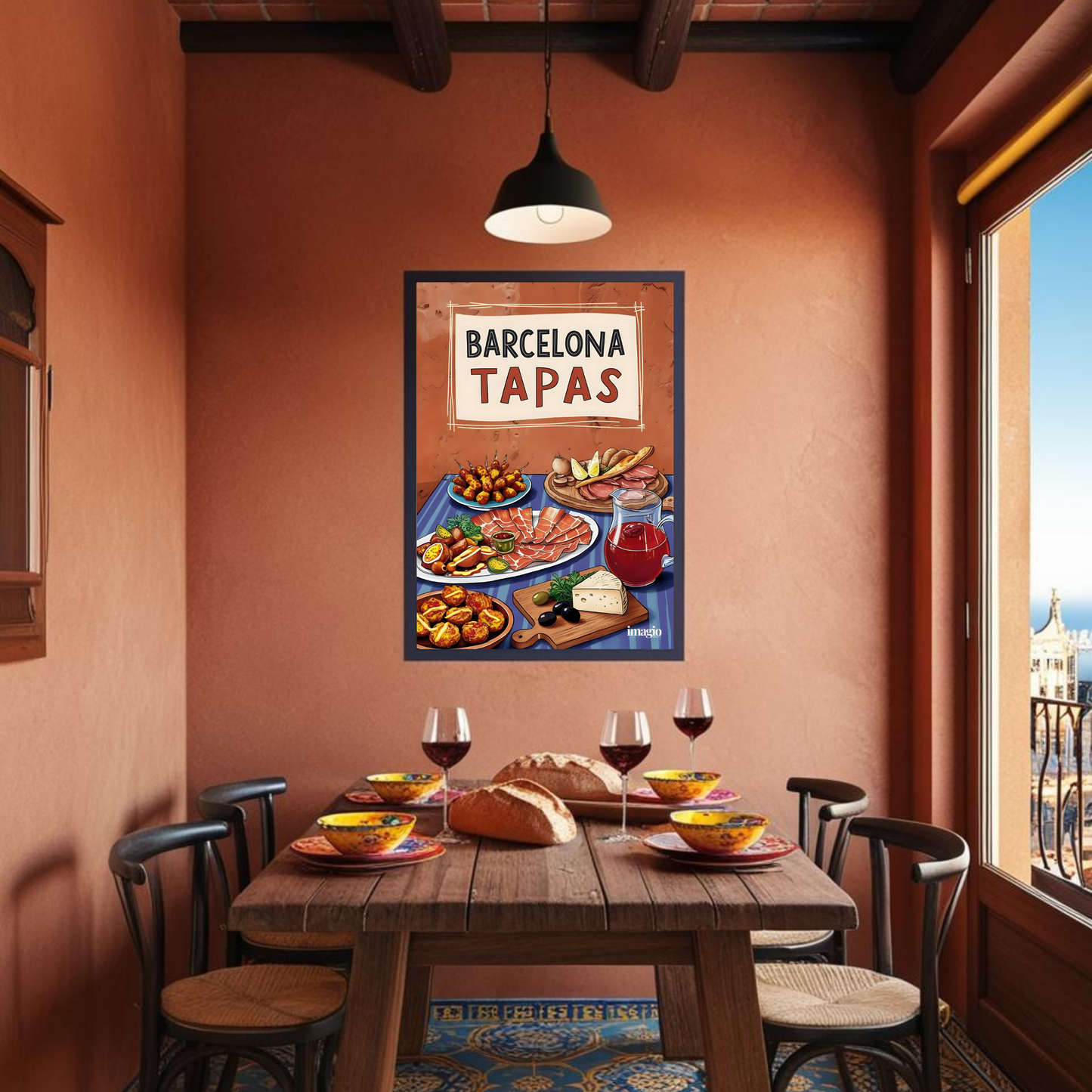 Spice up your walls with this Barcelona Tapas poster, featuring a vibrant scene that'll make your mouth water! Pair it with a glass of sangria for the ultimate experience. This print brings the taste of Spain right to your home.
