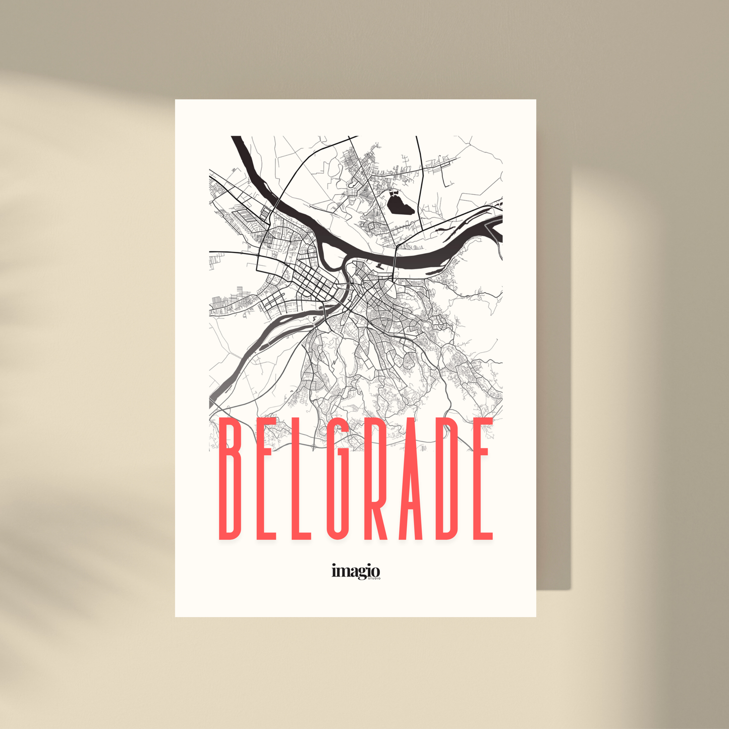 Introducing the Belgrade Map - a piece of digital art featuring the cityscape in sleek black with striking red lettering. Perfect for the discerning collector who appreciates both style and substance.