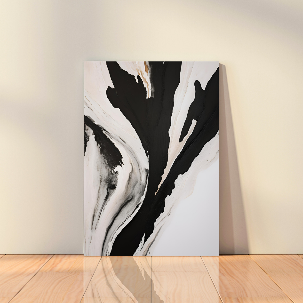 This canvas art showcases an abstract painting, capturing the unique brush movements for a dynamic and modern aesthetic resembling the marble design, dominating in black, white and with hints of beige tones. Expertly crafted, this piece adds a touch of sophistication to any space. Part of Imagio's Canvas Art collection.
