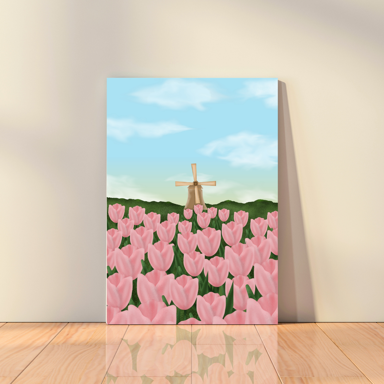 Add a splash of joy to your walls with this vibrant canvas art print of pink Dutch tulips, set against a scenic windmill backdrop. With a watercolor aesthetic, these flowers will brighten any room and transport you to a sunny field. (Cheerful and charming, this print is perfect for a playful touch in any space.) Part of Imagio's Canvas Art collection.