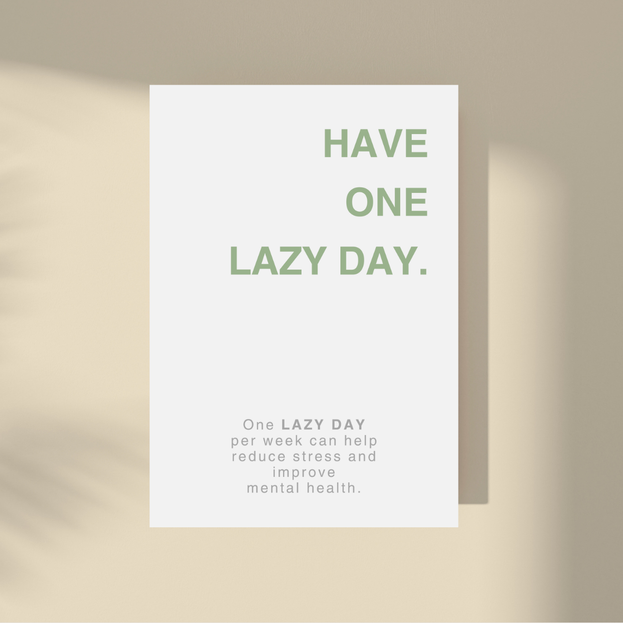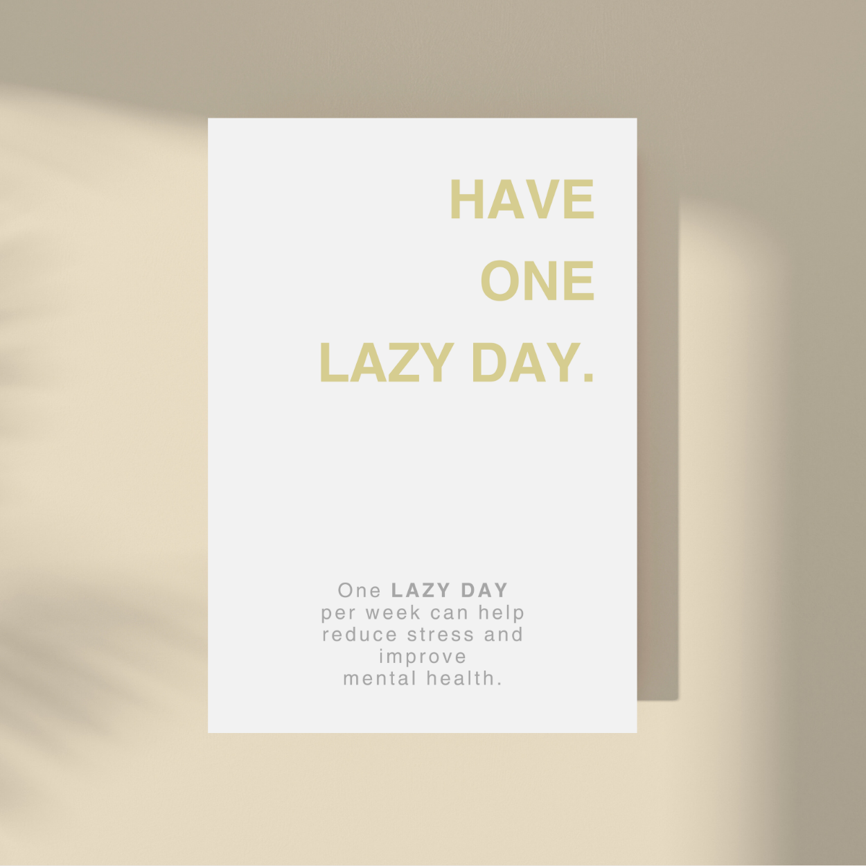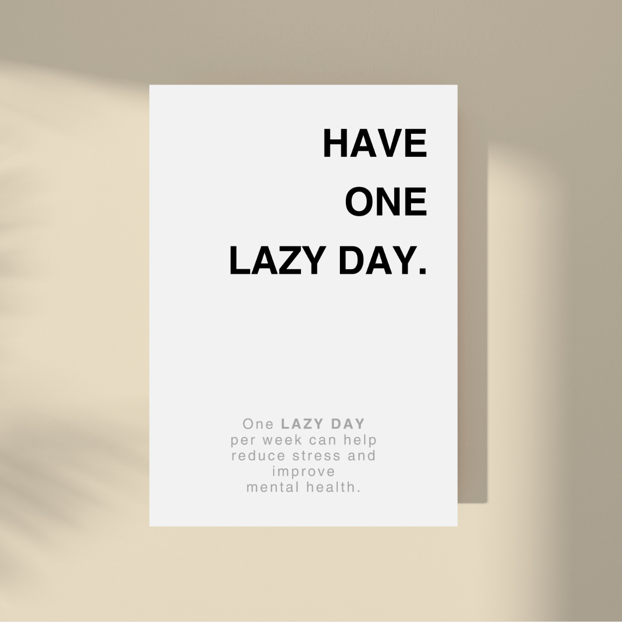 Embrace the present with our "Have One Lazy Day." framed artwork. Simple yet powerful, this minimalistic design features a supportive quote on a neutral background. Let it remind you to savor each moment and live in the now. A timeless addition to any interior, perfect for those seeking a touch of sophistication. This art is available in multiple colors.
