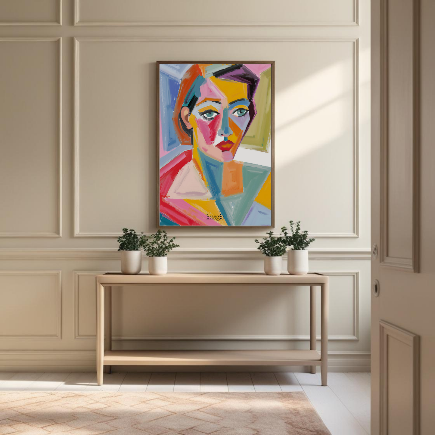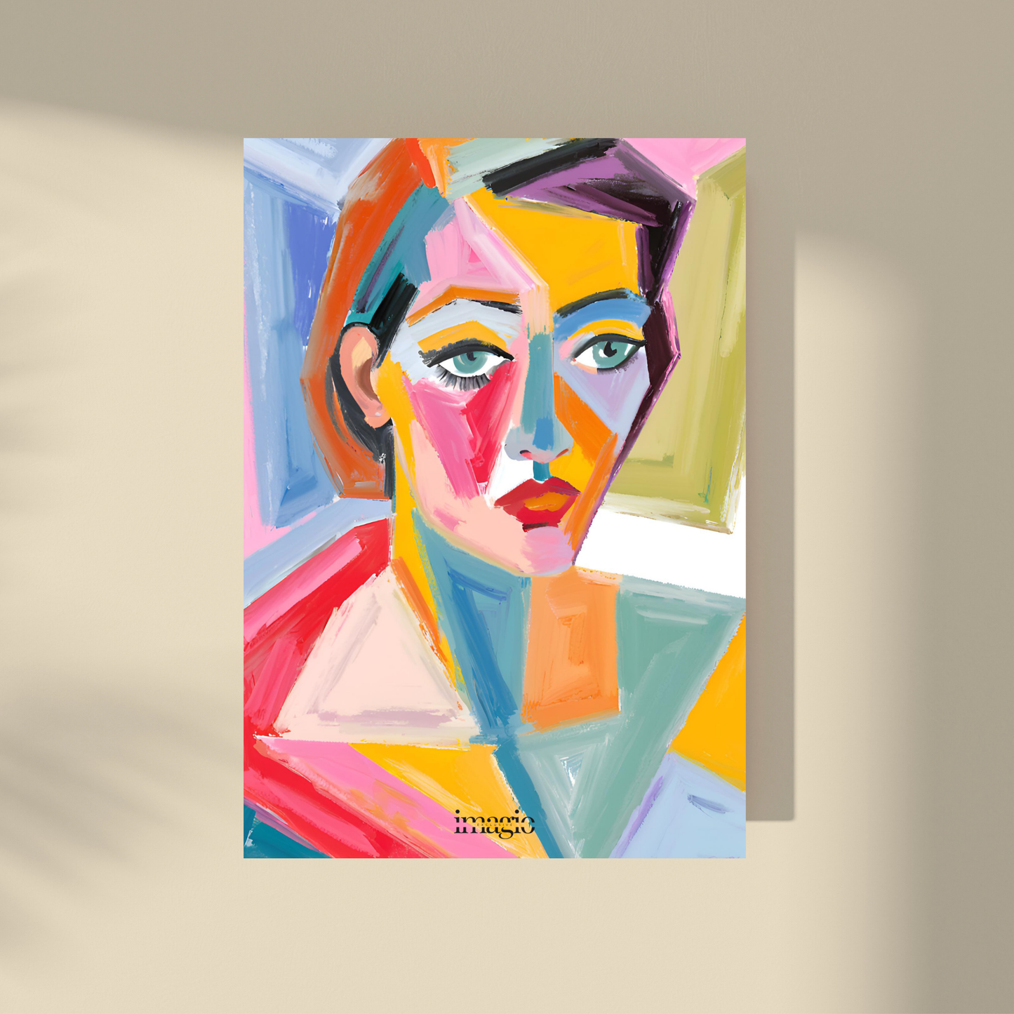 Elevate your space with this captivating art poster, designed in the timeless elegance of oil painting style, blending the bold geometry of cubism with the dreamlike essence of surrealism. The artwork features an abstract lady portrait that intertwines vivid shapes, striking contrasts, and flowing textures, creating a mesmerizing balance of mystery and emotion.
