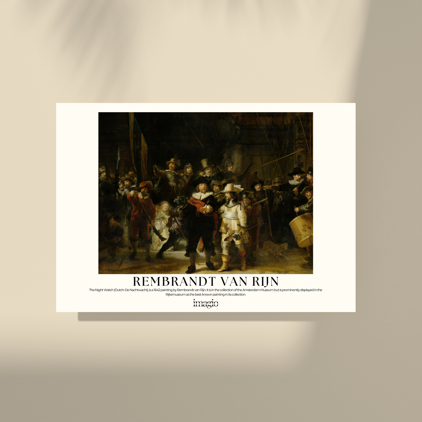 Rembrandt's "The Night Watch," formally titled "Militia Company of District II under the Command of Captain Frans Banning Cocq," is one of the most famous paintings of the Dutch Golden Age. Completed in 1642, this monumental work stands out for its dramatic use of light and shadow, known as chiaroscuro, which brings a vivid sense of motion and life to the scene. The painting depicts a group of Amsterdam's civic guardsmen, led by Captain Cocq, as they prepare for a parade. Unlike the static group portraits typical of the time, Rembrandt's composition is dynamic, with figures captured in mid-action, lending an almost cinematic quality to the scene. "The Night Watch" has endured as a masterpiece not only for its technical brilliance but also for its innovative approach to a traditional subject, cementing Rembrandt's legacy as one of history's greatest artists.