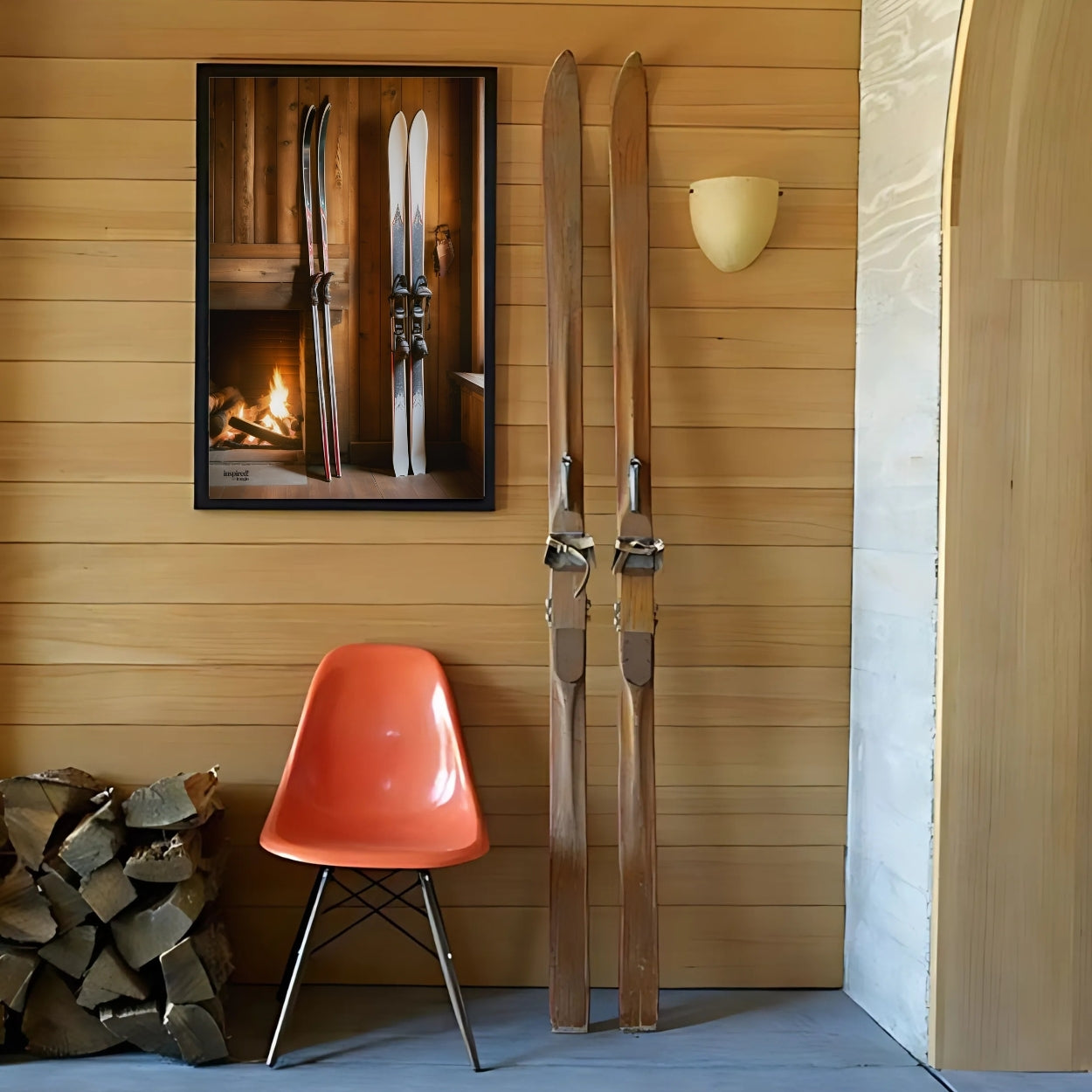 This poster beautifully captures the cozy charm of winter with a ski chalet and a crackling fireplace. Perfect for ski lovers and those who cherish the warmth and serenity of alpine retreats, this piece brings the magic of winter into any space.