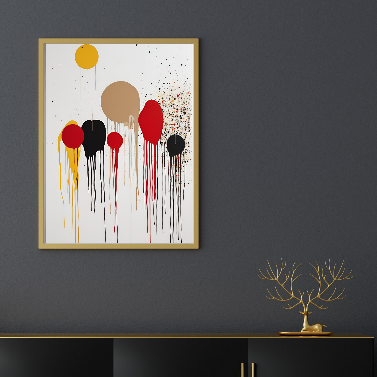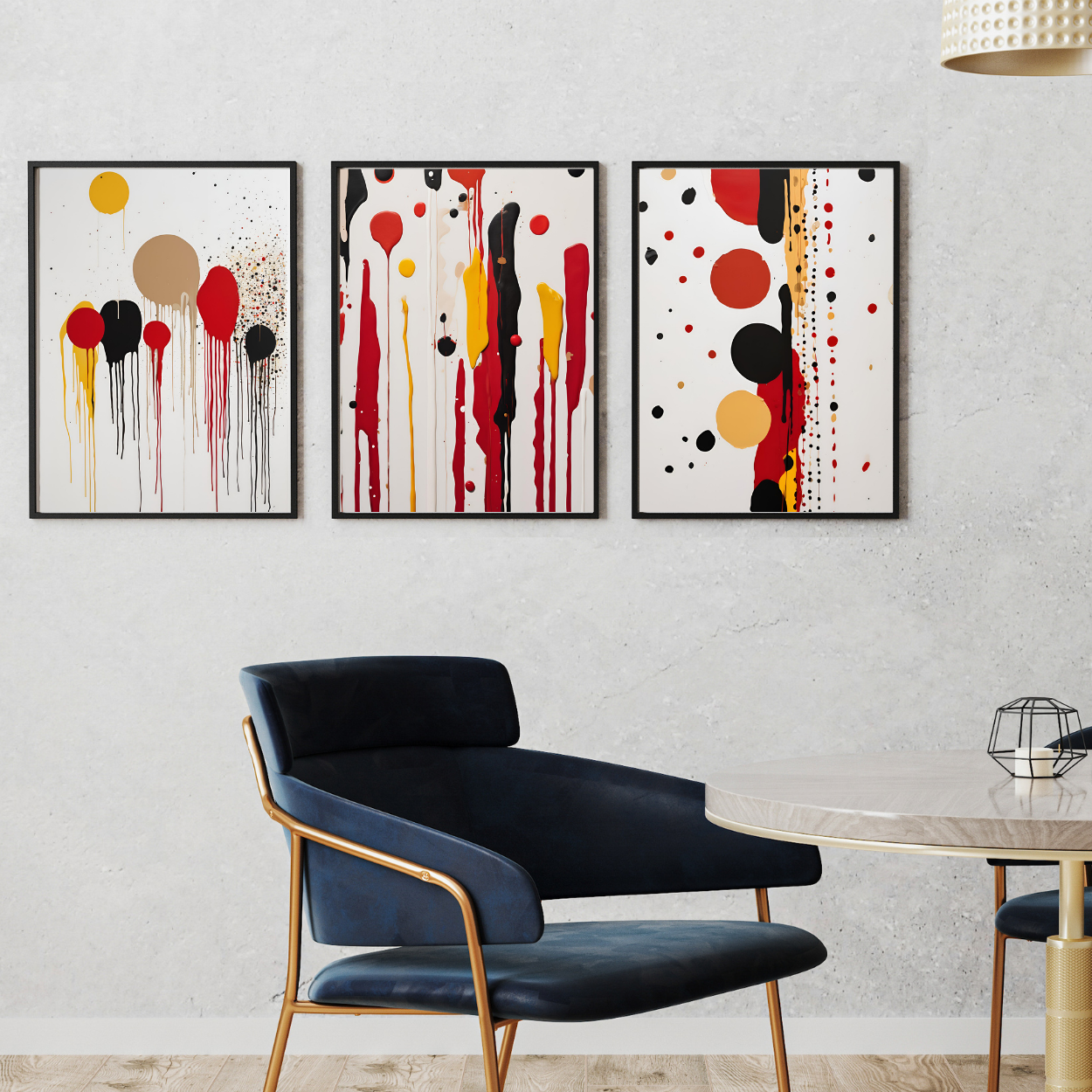 Experience the bold and vibrant energy of action painting with our - The Dots arts set, part of Splash 'n' Pour exclusive collection. This artistic print features actions of splashing and pouring of dominantly red, black, and yellow paint over white canvas, thus creating a truly unique and visually striking pieces of art. Add it to your collection today and elevate your home decor with a touch of creativity and artistry.