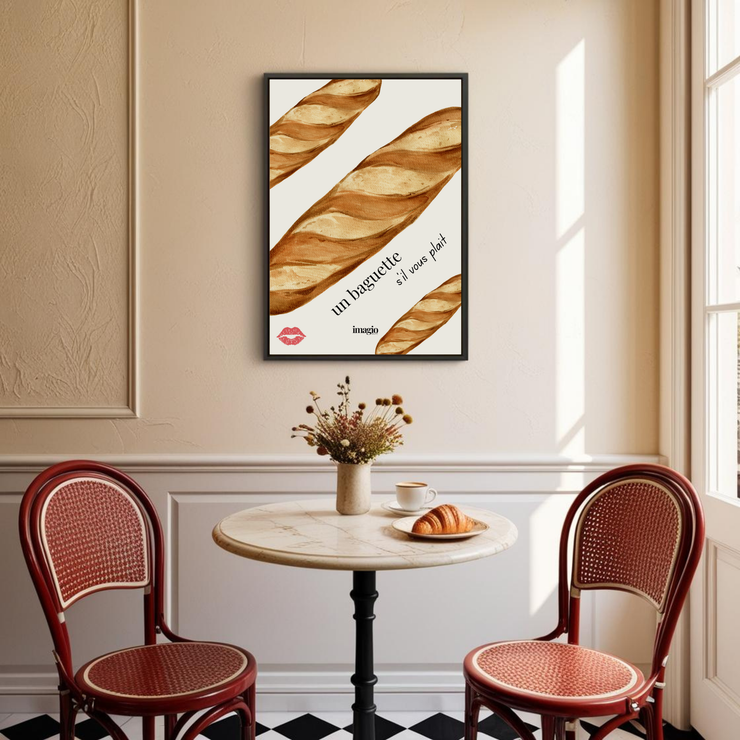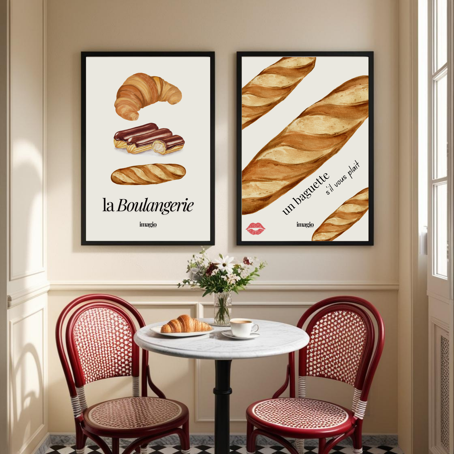 Indulge in a digital art print of your favorite bakery treats with La boulangerie! Featuring a colorful display of croissants, eclairs, and baguettes on a pink-beige background, this print is a delicious addition to any kitchen or dining room. Perfect for foodies and art lovers alike!