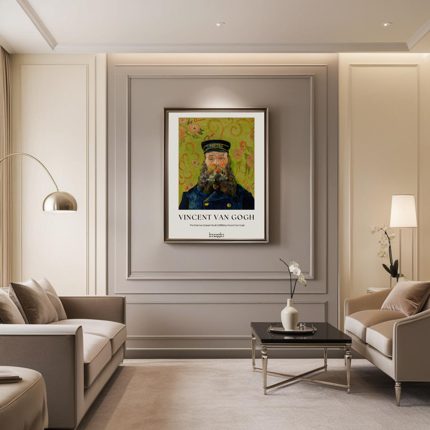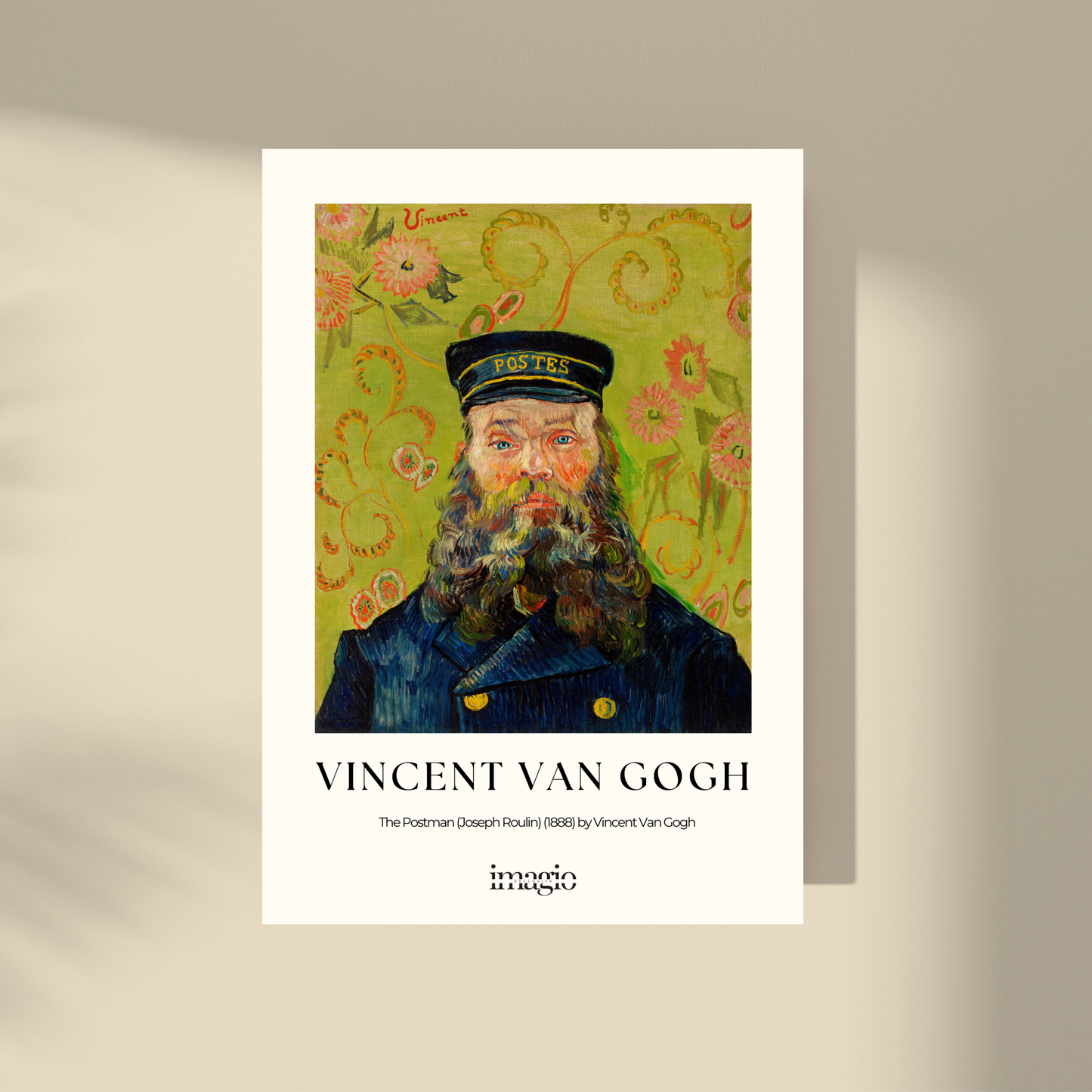 "The Postman" is a painting by Vincent van Gogh, completed in 1888 during his time in Arles, France. The artwork is a portrait of Joseph Roulin, a close friend of Van Gogh and a postal worker, who became one of the artist's most frequent subjects. Van Gogh admired Roulin's robust character and depicted him with vibrant, expressive brushstrokes that capture the essence of the postman's personality. The painting is notable for its bold use of color, particularly the rich blues and greens that create a striking contrast with the warm tones of Roulin's face and beard. This piece exemplifies Van Gogh's unique style and his ability to infuse ordinary subjects with emotional depth and intensity. The friendship between Van Gogh and Roulin is a testament to the artist's ability to find beauty and significance in everyday relationships, making "The Postman" a deeply personal and enduring work of art.