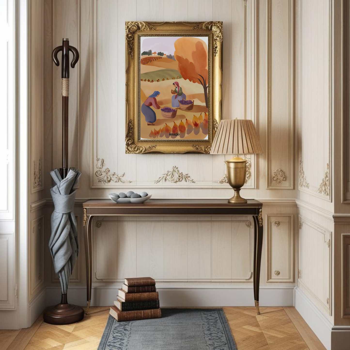 Experience the beauty of autumn in our Grape Harvest Watercolor art prints. This exquisite print series depicts girls harvesting red grapes for wine making, part of Winery in Autumn Collection. Let the vibrant watercolors transport you to the vineyards and immerse yourself in the harvest season. Elevate your home with this tasteful and exclusive piece.