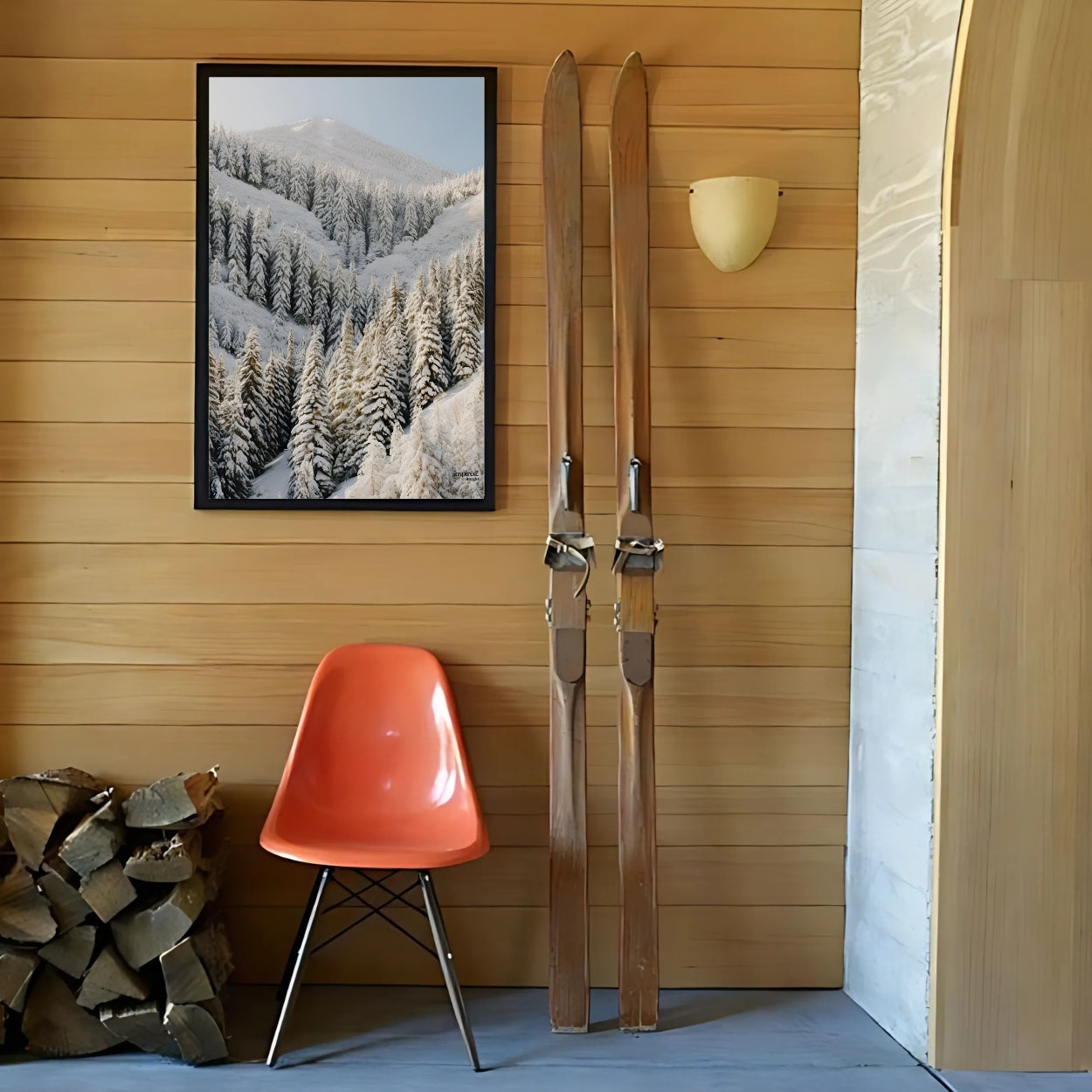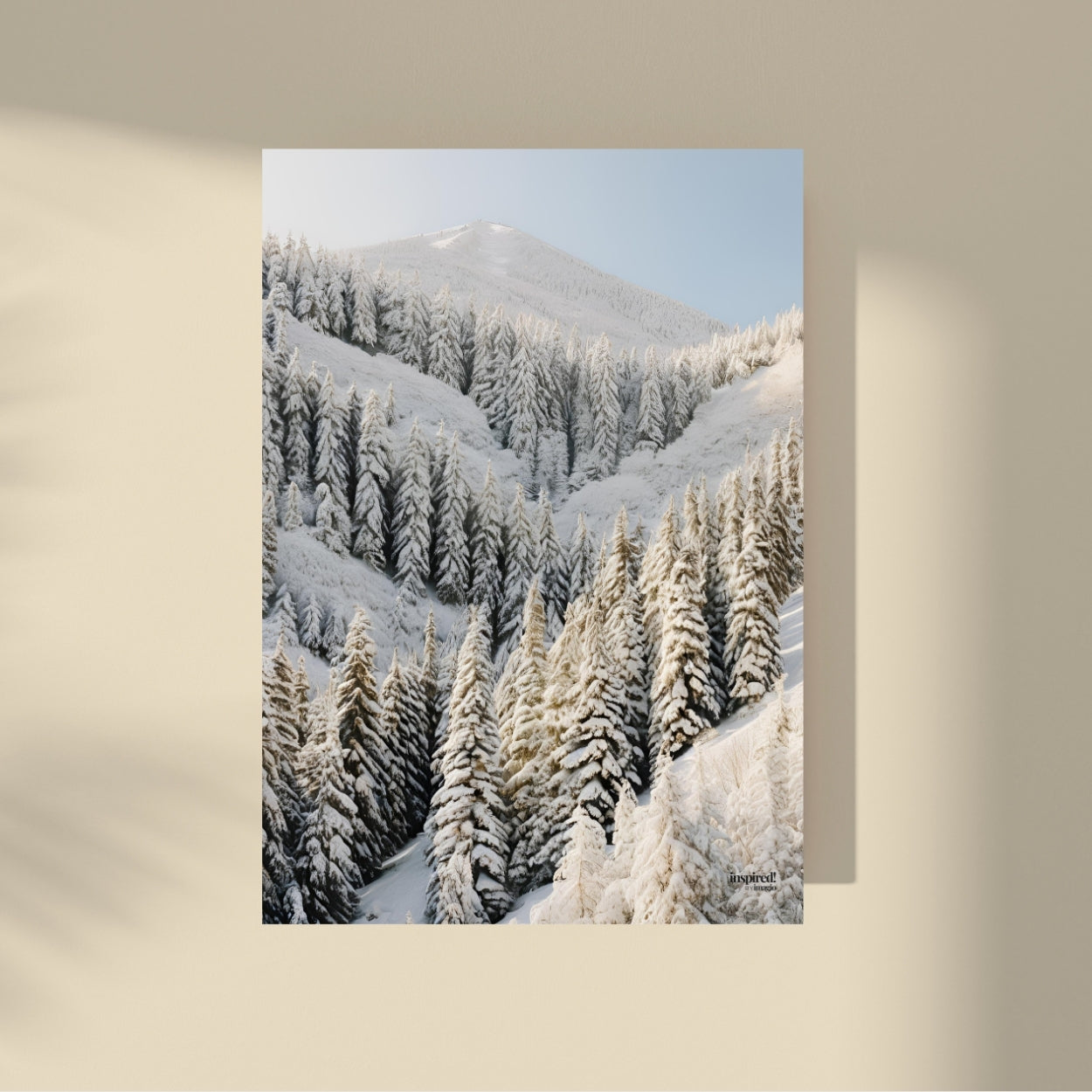 This poster features a winter landscape of mountain peaks and trees covered with a blanket of snow, creating a serene and captivating atmosphere. Perfect for nature and winter lovers, it brings the tranquility and beauty of a snowy idyll into your space. With intricately detailed snow-covered branches and a mountain horizon, this print will add a touch of winter freshness to your home, whether in the living room, bedroom or office.