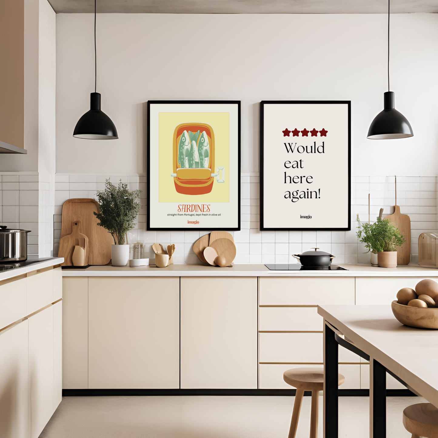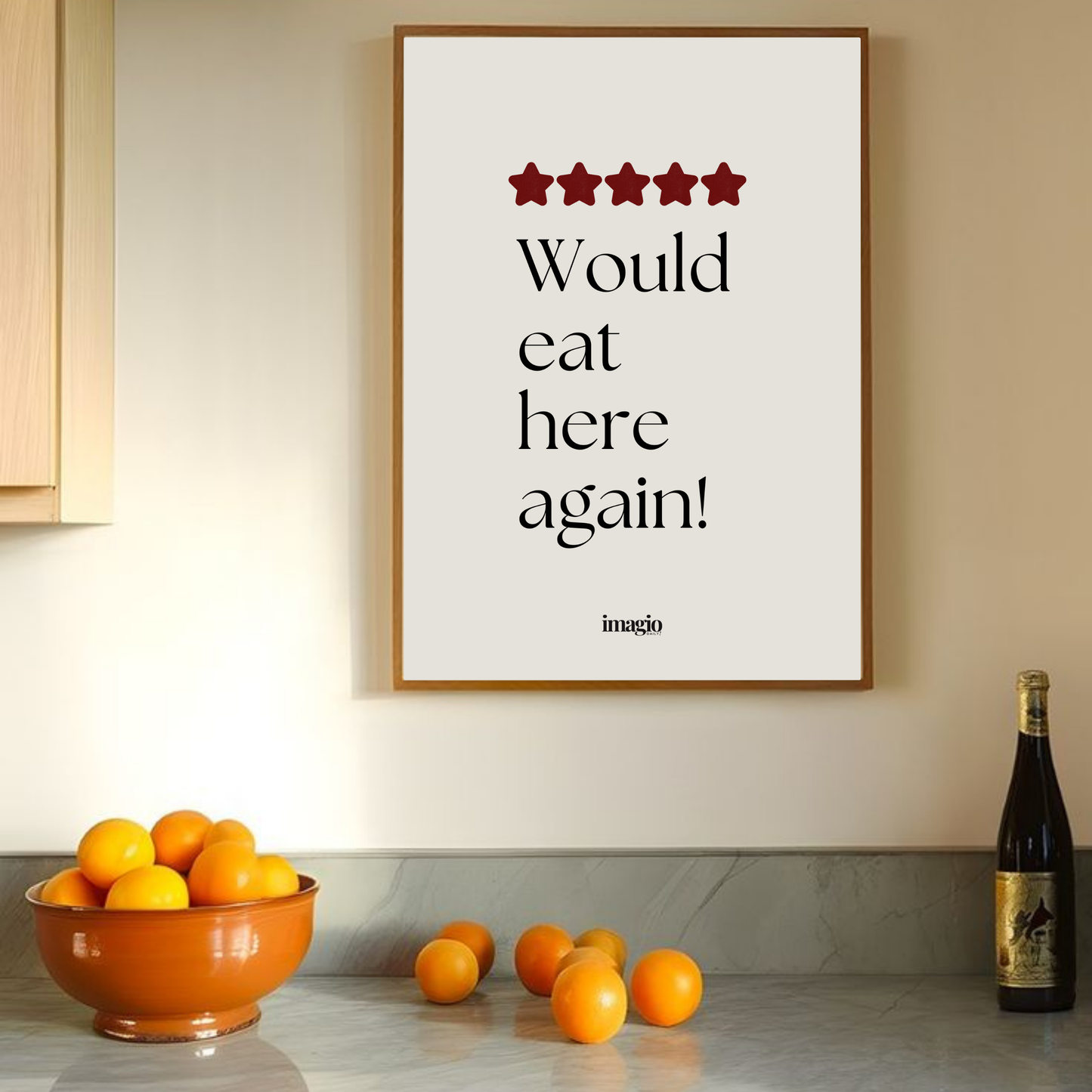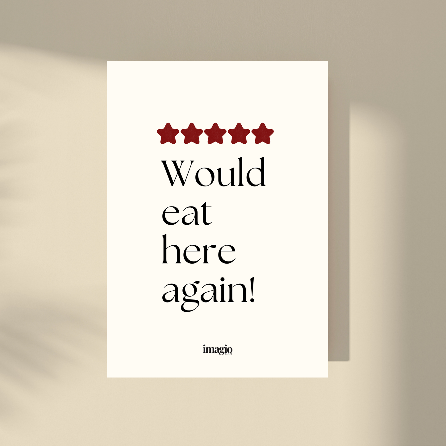 Satisfy your cravings with this "Would eat here again!" digital art print. Featuring a quirky and fun design of text and red stars on a white background, it's the perfect addition to any food lover's home. Don't settle for just any home decor, add a touch of humor and individuality to your space with this unique print. Rated 5 stars!