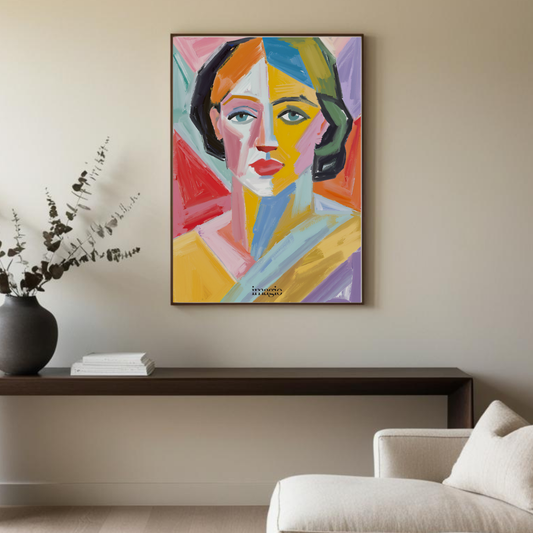 Unesite eleganciju u svoj prostor uz ovaj očaravajući umetnički poster, dizajniran u bezvremenskom stilu uljanog slikarstva, koji kombinuje hrabru geometriju kubizma sa snolikom suštinom nadrealizma. Umetničko delo prikazuje apstraktni portret dame koji spaja žive oblike, upečatljive kontraste i tečne teksture, stvarajući fascinantnu ravnotežu misterije i emocija.
