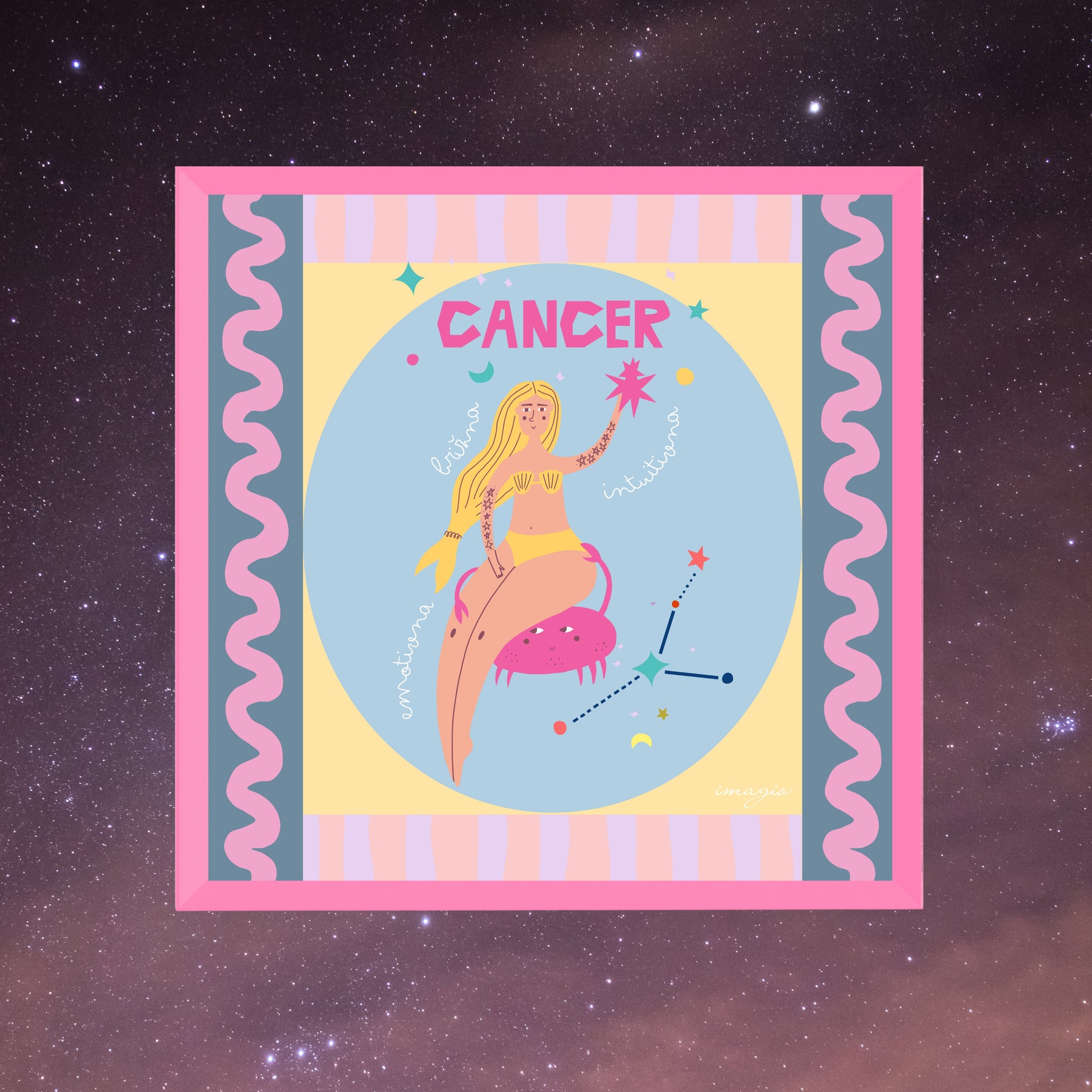 Slika iz Zodiac kolekcije sa prikazom sazvežđa i tri karakteristike znaka. Uramljena u okvir od punog drveta širine 1 cm, sa zaštitnim staklom debljine 2 mm. Spremna za kačenje.